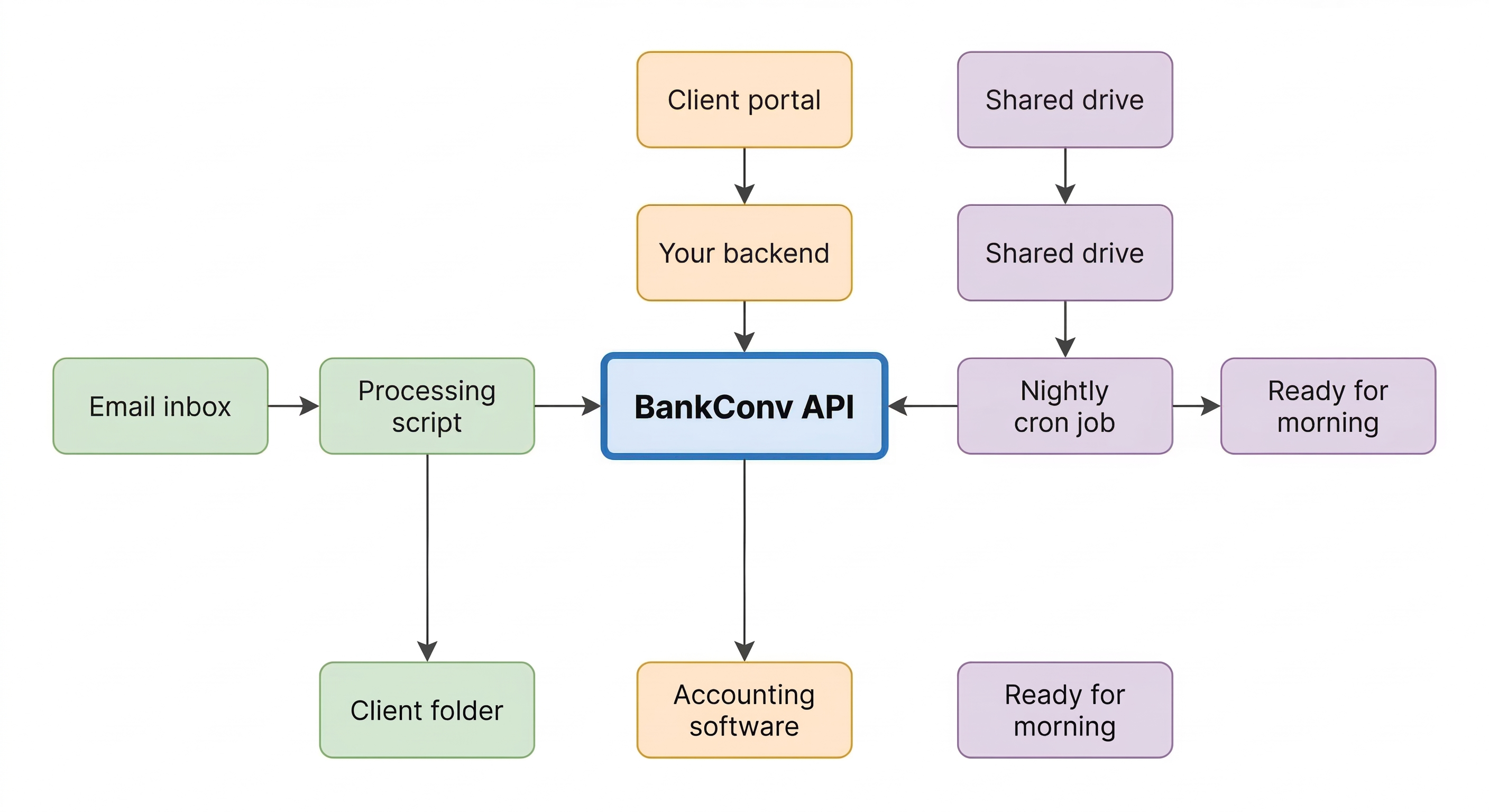 Email-to-spreadsheet pipeline. Set up a workflow where client emails with PDF attachments are automatically forwarded to a processing script. The script sends each PDF to BankConv's API, gets back structured CSV data, and saves it to the right client folder or uploads it to a shared drive.