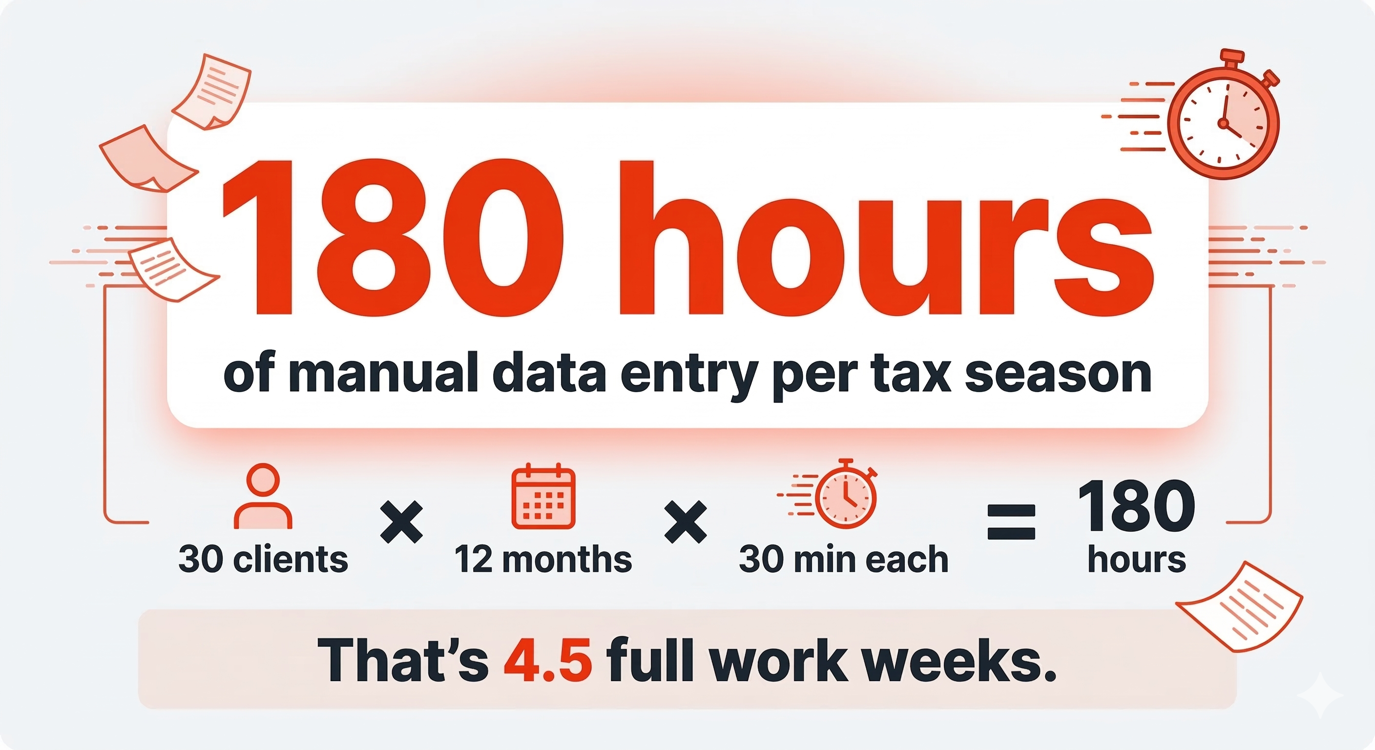 The math is rough. At 30 minutes per statement and 360 statements, that's 180 hours of pure data entry — more than four 40-hour work weeks. And that's before you've categorized a single transaction, prepared a single return, or had a single client conversation.