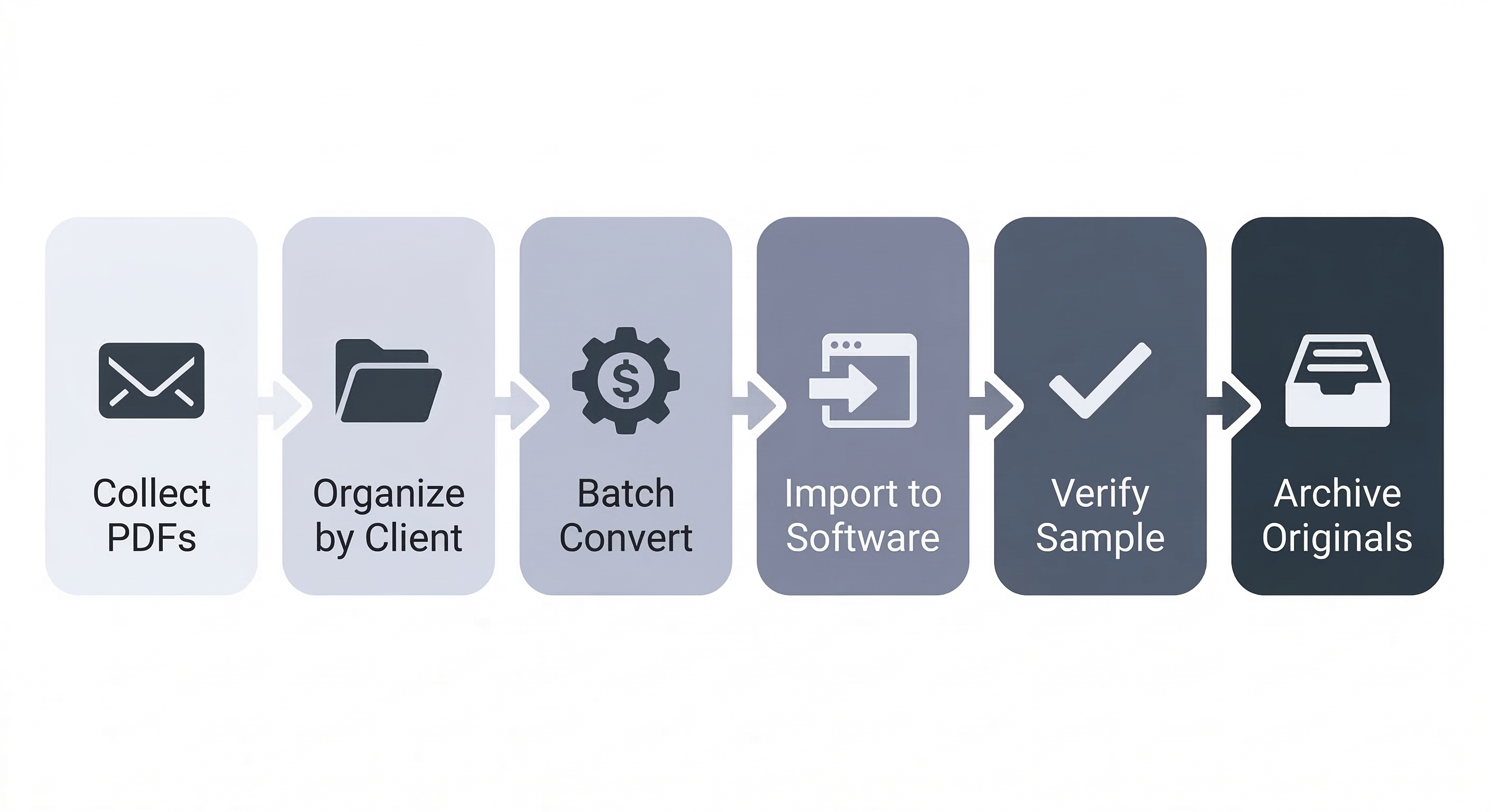 2. Organize before converting. Set up a consistent folder structure — one folder per client, subfolders by account or year. This seems basic, but it prevents the chaos of processing 300+ files with ambiguous names.