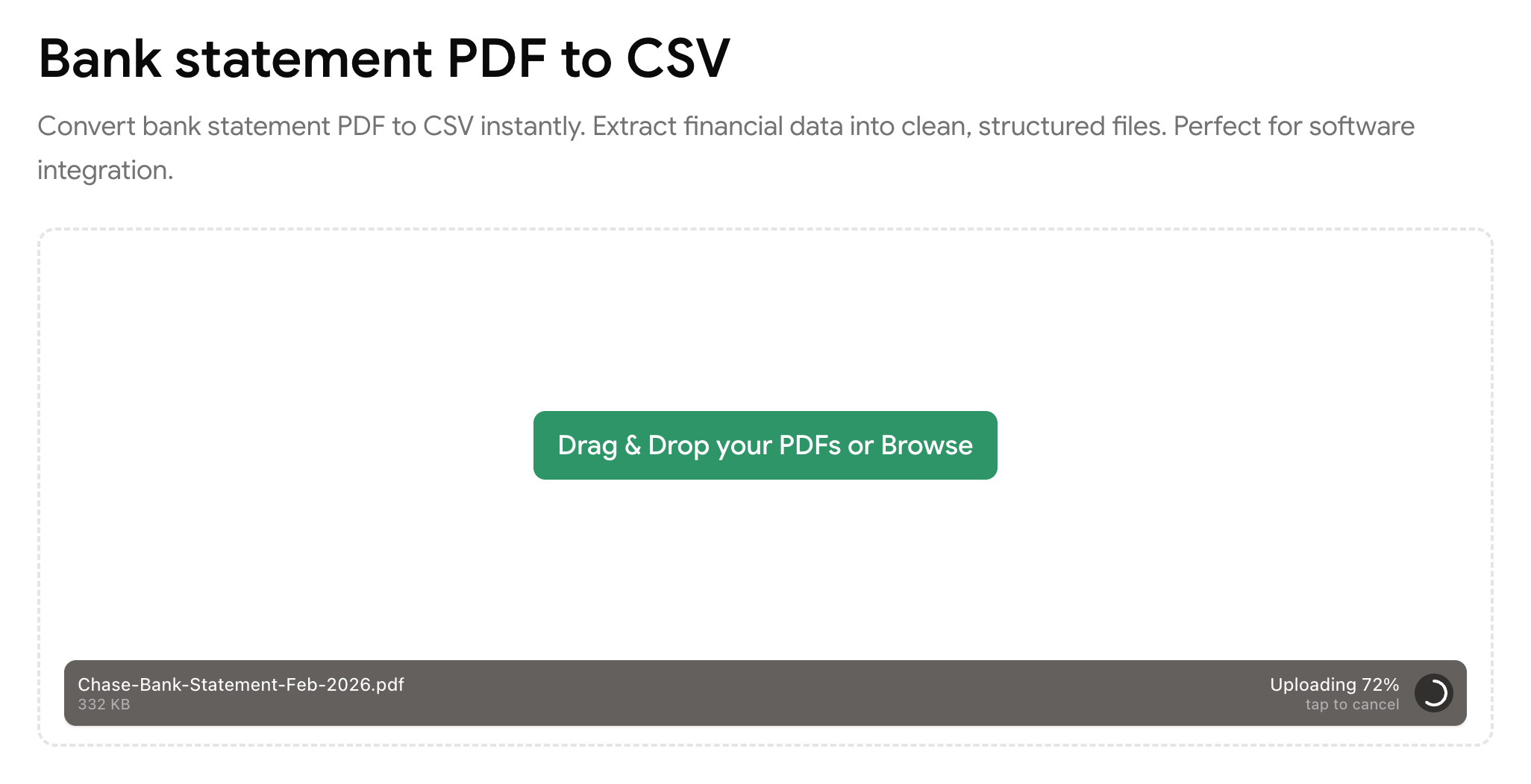 Multiple statements at once: Need to convert several months of Chase statements? You can upload multiple files in one batch instead of converting them one at a time. This is especially useful during tax season or when onboarding a new bookkeeping client.