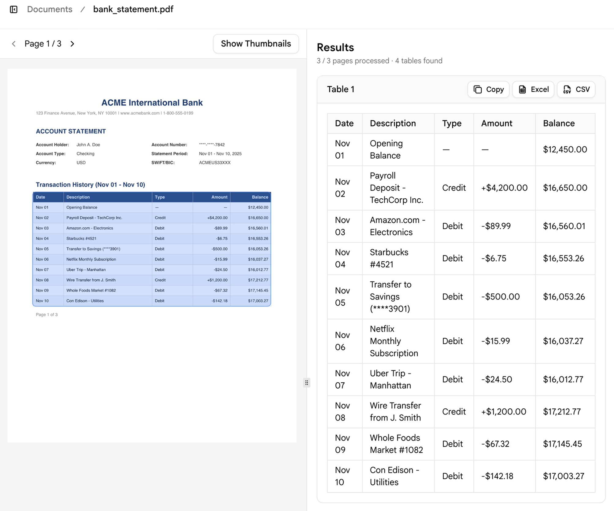 General PDF table extractors treat every PDF table the same way. They don't know that a bank statement has specific column patterns (date, description, debit, credit, balance), so you'll often get:
